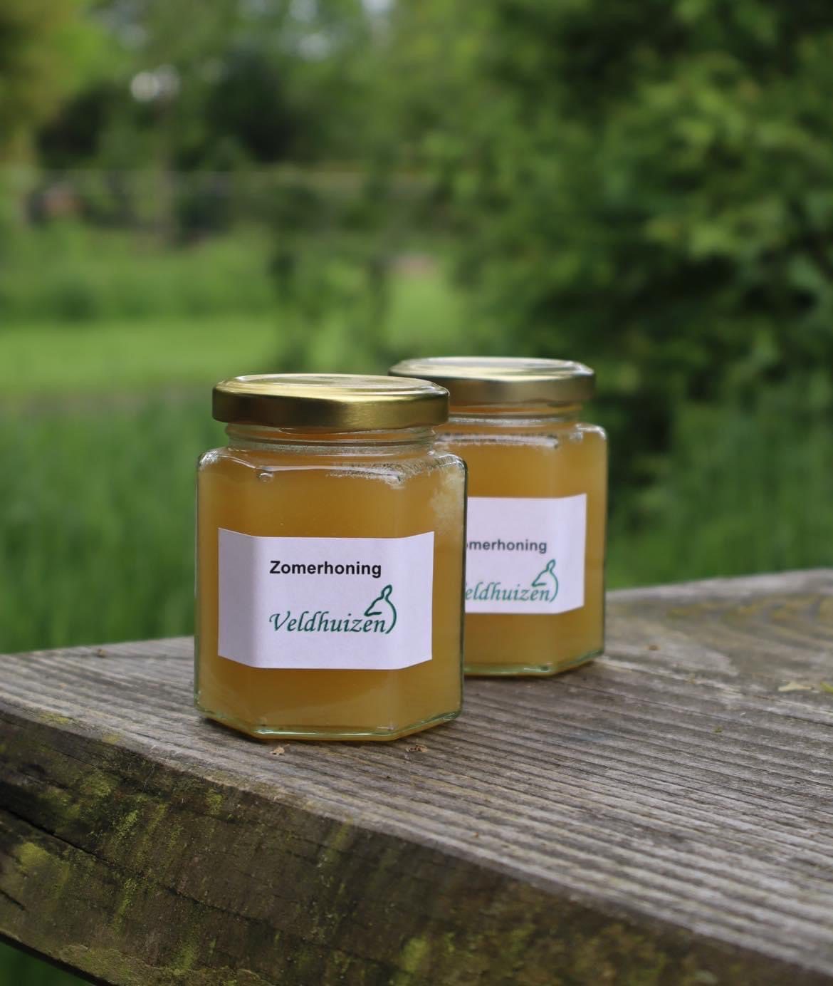 Elke zomer huisvesten we verschillende bijenvolken op het terrein. De bijen hebben de belangrijke taak om alle bomen en planten rond Veldhuizen te bestuiven. Bijen zijn onmisbaar voor een gezond ecosysteem. De aanwezigheid van de bijenkasten sluit direct aan op de aanplant van de inheemse bomen en struiken, waardoor er een duurzaam geheel ontstaat. Het resultaat: eigen honing van Veldhuizen.