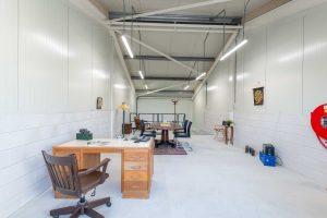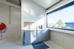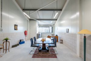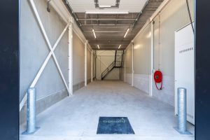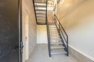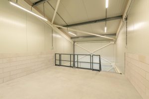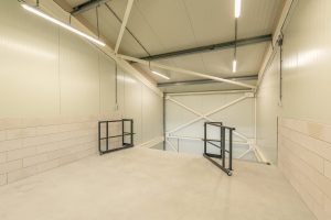 - Indeling: begane grond met hoge overheaddeur; vaste trap naar verdieping met pantry en toiletruimte.